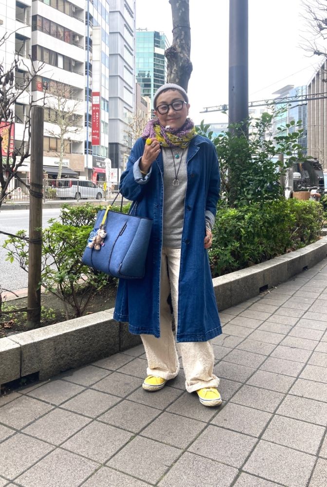 「ブルーデニム×気分の上がるイエローアイテムで春の爽やかな装いを意識しました。デニムコートのブルーが重く見えすぎないようインナーは軽快なグレーやホワイトに。カジュアル色の強いコーデではありますが、ストールやアクセサリーで大人な遊び感のあるアレンジを加えています」