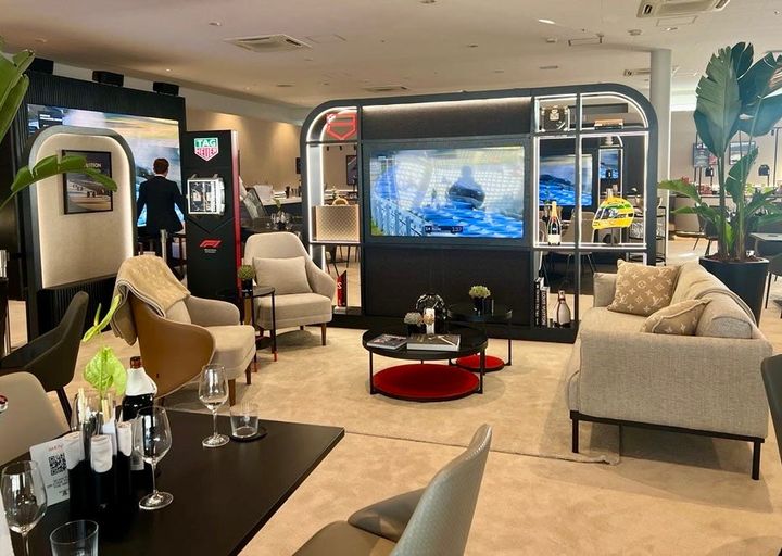 今回、観戦させてもらったパドッククラブ内には、LVMH専用のスペースが設けられ、まさにそこは“ルイ・ヴィトン サロン”。メゾンの象徴であるトランクやホームアイテムが美しくディスプレイされ、モータースポーツの現場であることを忘れるほどエレガントな空間。厳選されたケータリング、シャンパンが供されるカフェバーを備え、楽しくも過酷な屋外観戦とは無縁の、完璧なホスピタリティがそこにはあった。