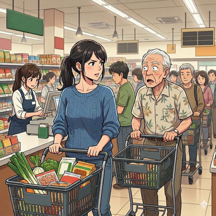 私もカートいっぱいの食材を抱え、前の人の会計が終わるのを待っていたんです。