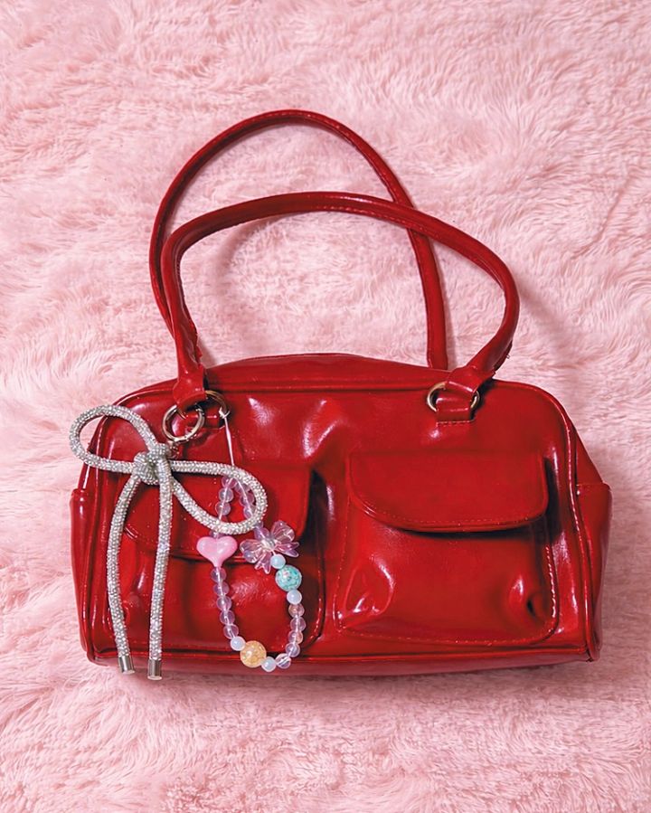 「キラキラのビジューがついたリボンチャームとキーホルダーは韓国旅行に行ったときに1,500円くらいで購入。大きなリボンが目立つように、つけすぎず、シンプルな組みあわせにしました」