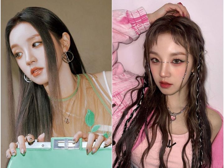 最新曲「Nxde」で全員金髪になった(G)-IDLEメンバー。活動期間を終えて、ミヨン、ウギに続きリーダー・ソヨンも黒髪に。根本にしっかりボリュームを出した豊かな黒髪は、毛先をゆるく巻いてソヨンのパワフルなムードをソフトに中和。