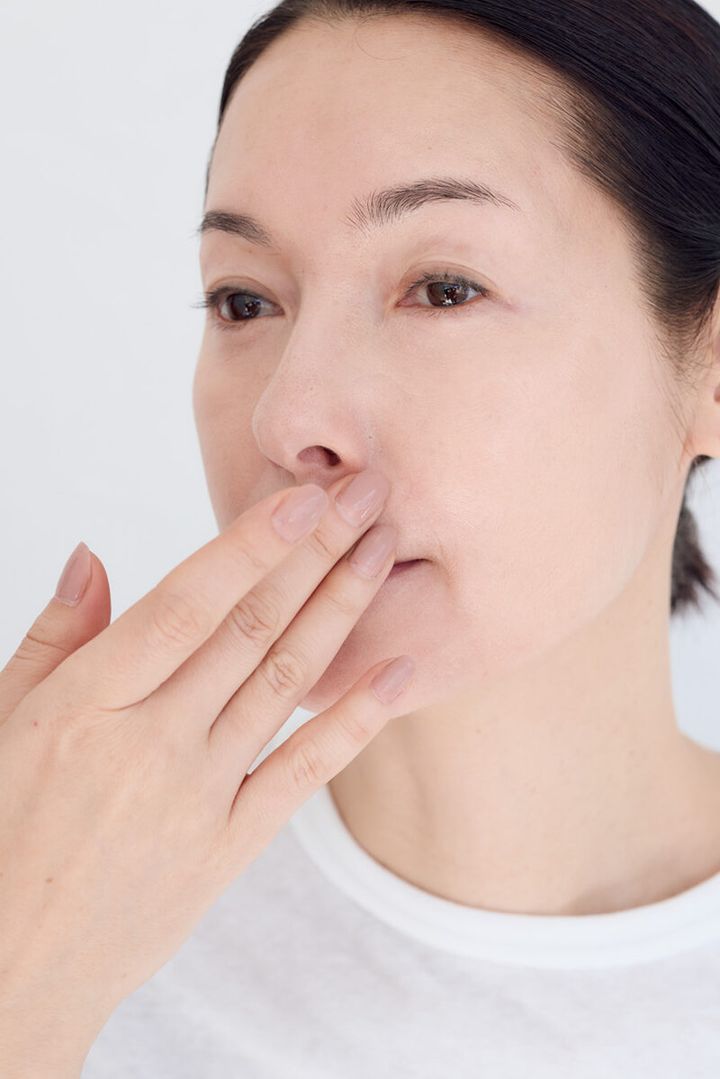 まず頬にのばし、指に余った分を鼻の周りや鼻下、あごにのばす。