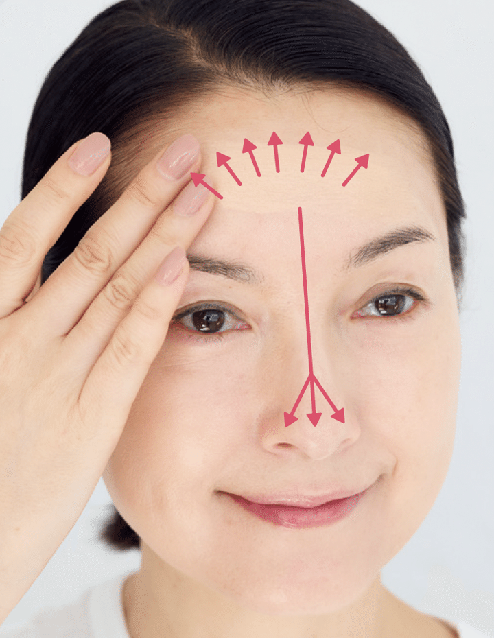 額の中央へ横長につけ、上方向へは放射状に、上方向へは放射状に、下方向へは鼻筋、鼻先、小鼻までのばす。
