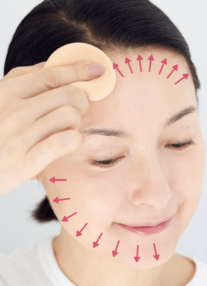 容器をひっくり返してパフにパウダーを取り、ティッシュにクルクルしてパフ全体になじませてから、パフを肌にすべらせるようにつける。額は軽く押さえる。