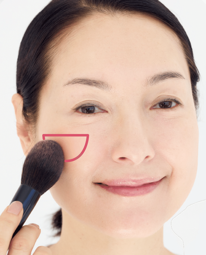 チークを大きめブラシに取り、黒目の下を起点として、まず頬骨までまっすぐに引く。次に起点から頬骨まで弧を描くようにつける(逆かまぼこ型に)。