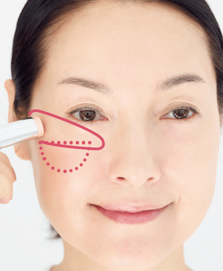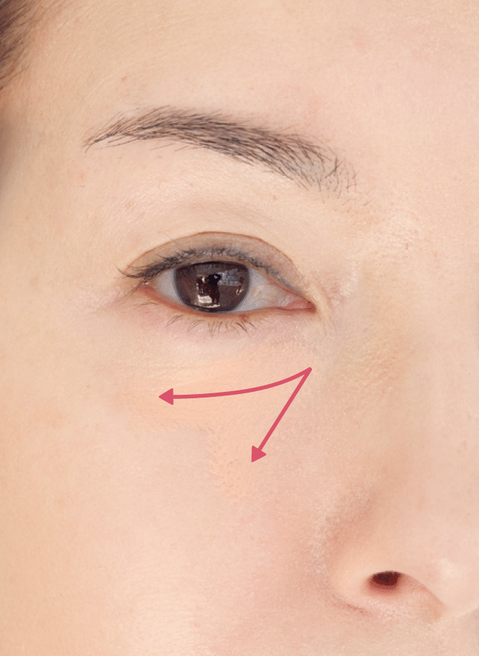 オレンジ色のコンシーラーを目頭の下に矢印のようにつけて、指先でトントンなじませる。