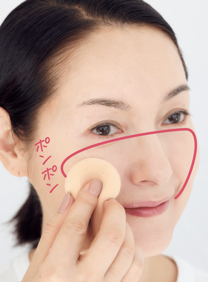 額、両頬、あご先に置いて外側へ指でのばしたら、スポンジをすべらせて表面をならす。