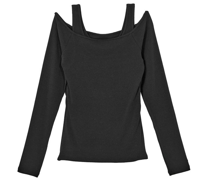トレンド継続のレイヤードスタイルが即手に入る、ロンTとタンクがドッキングした1着。これひとつでヘルシーでしゃれた肌見せが叶う。シンプルな黒は使い勝手も◎。レイヤードトップス ¥6,990 (Gap)