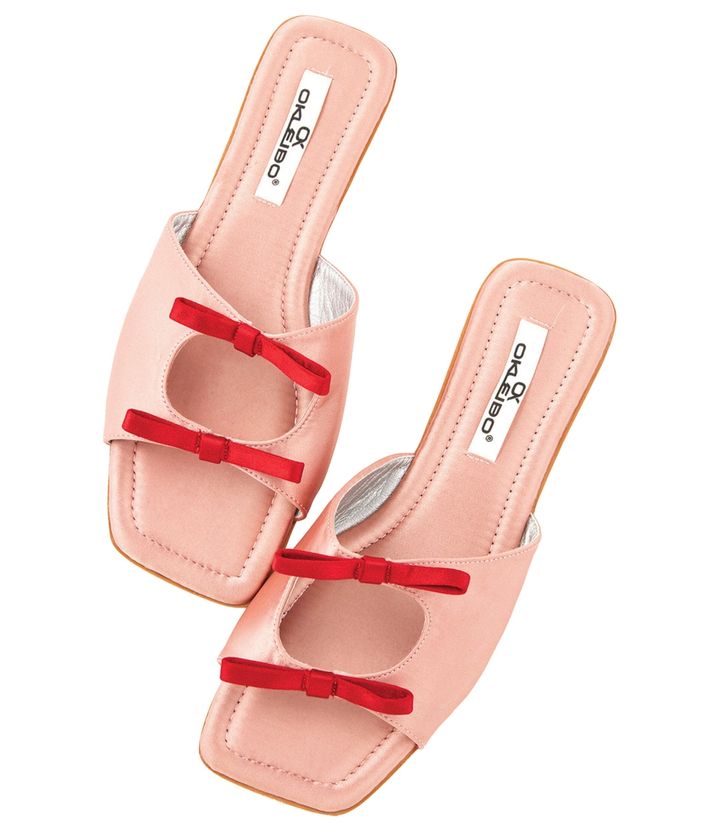 少女感漂う赤リボン×ピンクのサテンが心をくすぐるミュールサンダルは、はくだけで気分が上がる1足。エレガントなスタイルからカジュアルなスタイルまで、意外と万能なところもLOVE。サンダル ¥5,980 (LiLiRena)