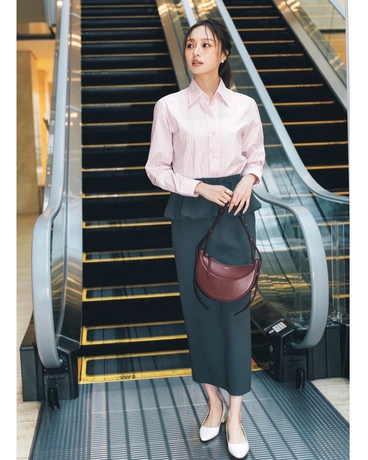 4月14日(火)、シンプルなシャツ×スカートのワンツーコーデも、ピンクを選べば一気に華やかな印象に。顔まわりを明るく見せてくれるから、きちんと感はありつつもかしこまりすぎない好印象が叶います。白シャツの次に1枚は持っておきたい、まさにマストアイテム。ボルドーバッグでコーデに深みをプラスし、ピンク×グレーでまとめれば、通勤にも使える上品スタイルに。