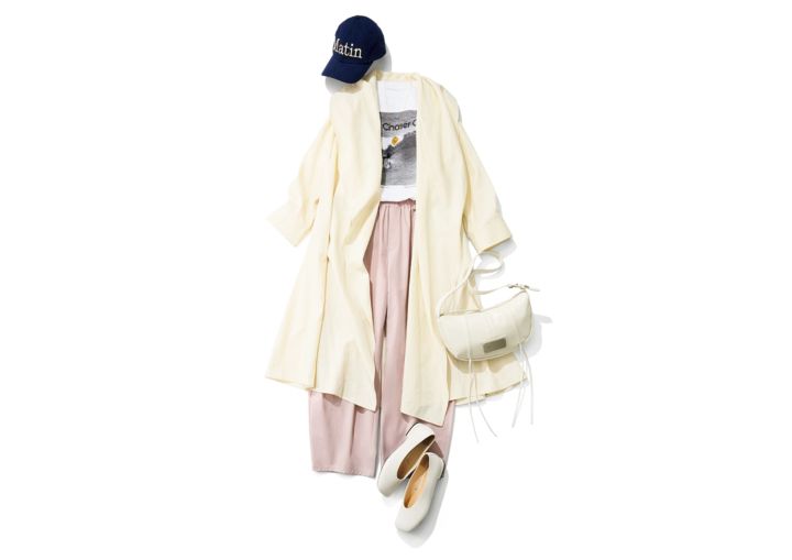 スプリングコート¥38,500/ánuans Tシャツ¥14,300 / スリードッツ( スリードッツ表参道店) タフタパンツ¥17,600/マイストラーダ シャーリングバッグ¥19,734、キャップ¥8,294/ともにマーティンキム(マーティンキム渋谷店) スクエアトウパンプス¥9,990/PLST コインネックレス¥18,700 / チビ・ジュエルズ(チビジュエルズ・ジャパン)