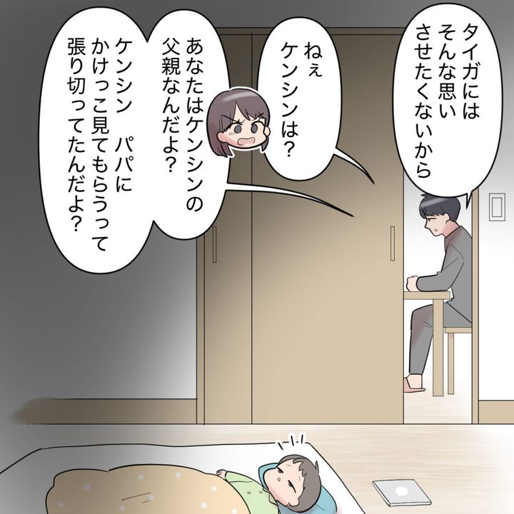 「タイガにはそんな思いさせたくないから」とシンジは私を説得しようとしましたが、どうしても納得できない私は「ねぇ、ケンシンは?あなたはケンシンの父親なんだよ?ケンシン、パパにかけっこ見てもらうって張り切ってたんだよ?」と反論しました。だって、タイガくんがカオルさんのように父親がいなくて寂しい思いをするというのなら、ケンシンだってシンジが来なかったら寂しい思いをすることになります。それなのに、ケンシンの運動会を欠席してまでタイガくんの運動会に行くというシンジの考えは納得できるはずがありません。