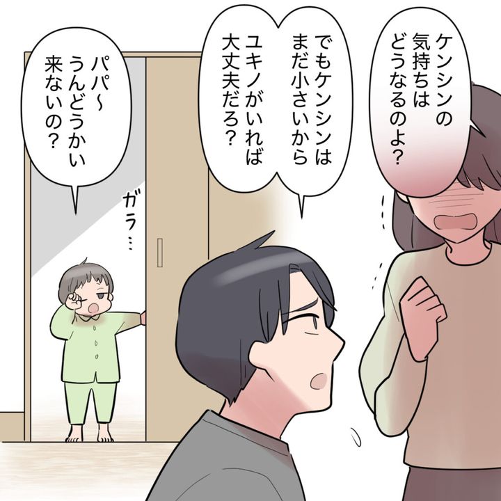 「ケンシンの気持ちはどうなるのよ?」私はケンシンの気持ちを思うと涙が出そうでした。しかし、シンジは「でもケンシンはまだ小さいから、ユキノがいれば大丈夫だろ?」と言ったのです。あまりに無神経なことを言うシンジに言い返そうとしたとき、目を覚ましてしまったケンシンが「パパ~、うんどうかい来ないの?」と部屋に入って来ました。