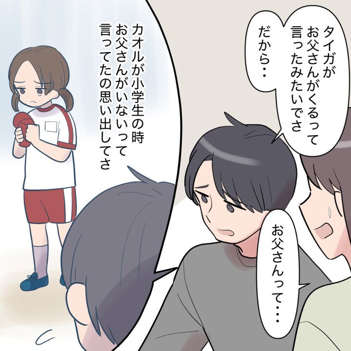 すると、シンジは「タイガがお父さんが来るって言ったみたいでさ。だから・・」と気まずそうに言いました。「お父さんって・・」と呟く私の声は届いているのかいないのか「カオルが小学生の時、お父さんがいないって言ってたの思い出してさ」と子どもの頃のことを思い出してしんみりするシンジ。