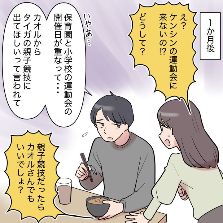 それから1ヶ月後。「え?ケンシンの運動会に来ないの!?どうして?」ずいぶん前から運動会の予定は伝えていたはずなのに、突然シンジが行けないと言い出したのです。理由を聞くと、「いやぁ・・保育園と小学校の運動会の開催日が重なって・・。カオルからタイガの親子競技に出てほしいって言われて」と自分の息子の運動会よりも甥っ子の運動会を優先すると言うシンジ。腹立たしさを感じた私は「親子競技だったらカオルさんでもいいでしょ?」と反論しました。