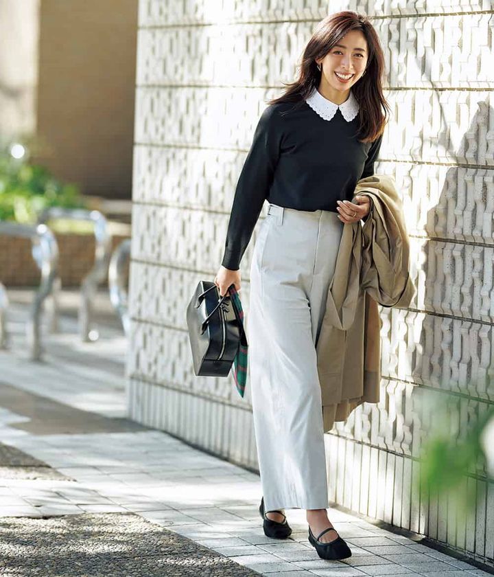 まだ冷え込む朝晩は春コートを羽織るけれど、日中はニット1枚で。清潔感のある白衿付きなら、1着でオシャレもきちんと感も叶えます。表情を明るく見せる効果も!