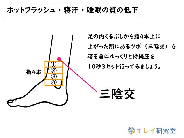 おすすめのツボとして、足の内くるぶしから指4本上に上がった所にある三陰交というツボがおすすめです。