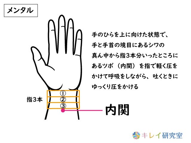 おすすめのツボは手のひらを上に向けた状態で、手と手首の境目にあるシワの真ん中から指3本分いったところにある内関というツボです。