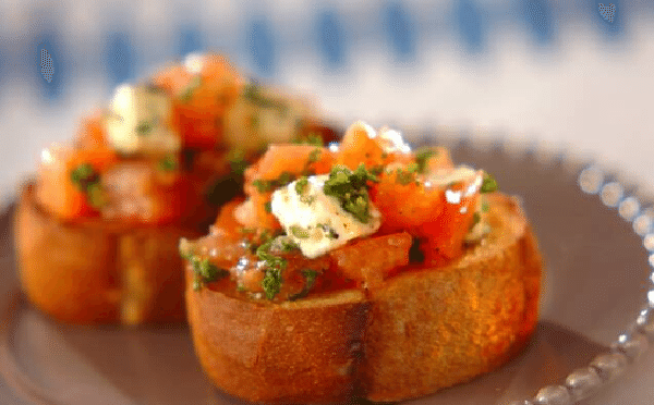 カリッと香ばしく焼いたバゲットに、トマトとクリームチーズをのせたオシャレなカナッペです。一口頬張ると、オリーブオイルとニンニクの香りが鼻から抜け、奥行きのある味わいを堪能できます。お好みでバゲットの厚みを変えるのもアリです。