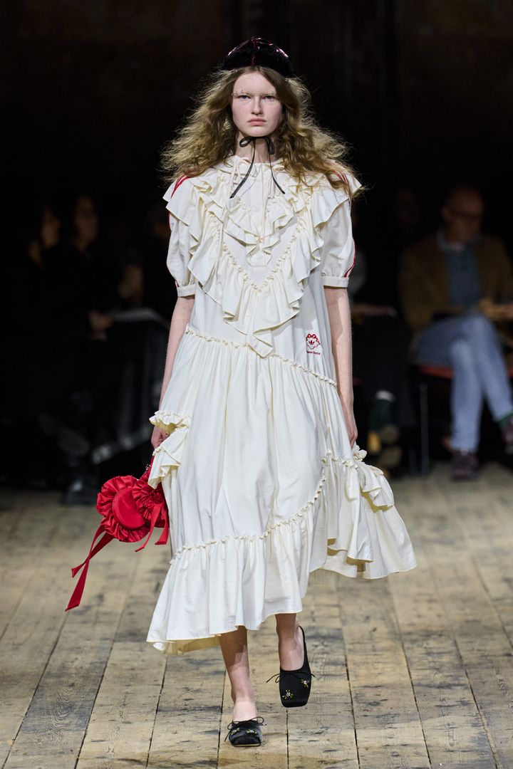 第2章では、90年代ダブリンのトラベラー・コミュニティーとポニーの文化へ。写真集『Pony Kids』に写る若者たちのリアルな装いが神話と接続し、「アディダス オリジナルス」との協業へと発展した。象徴的なスリーストライプはロングドレスの肩を走り、トラックジャケットはチュールと重なり、バレエシューズとスニーカーのハイブリッドによる3種類のフットウェアも登場。スポーツウェアはレースやラッフルで再構築され、MA-1やシアリングが幻想を現実へと引き戻す。