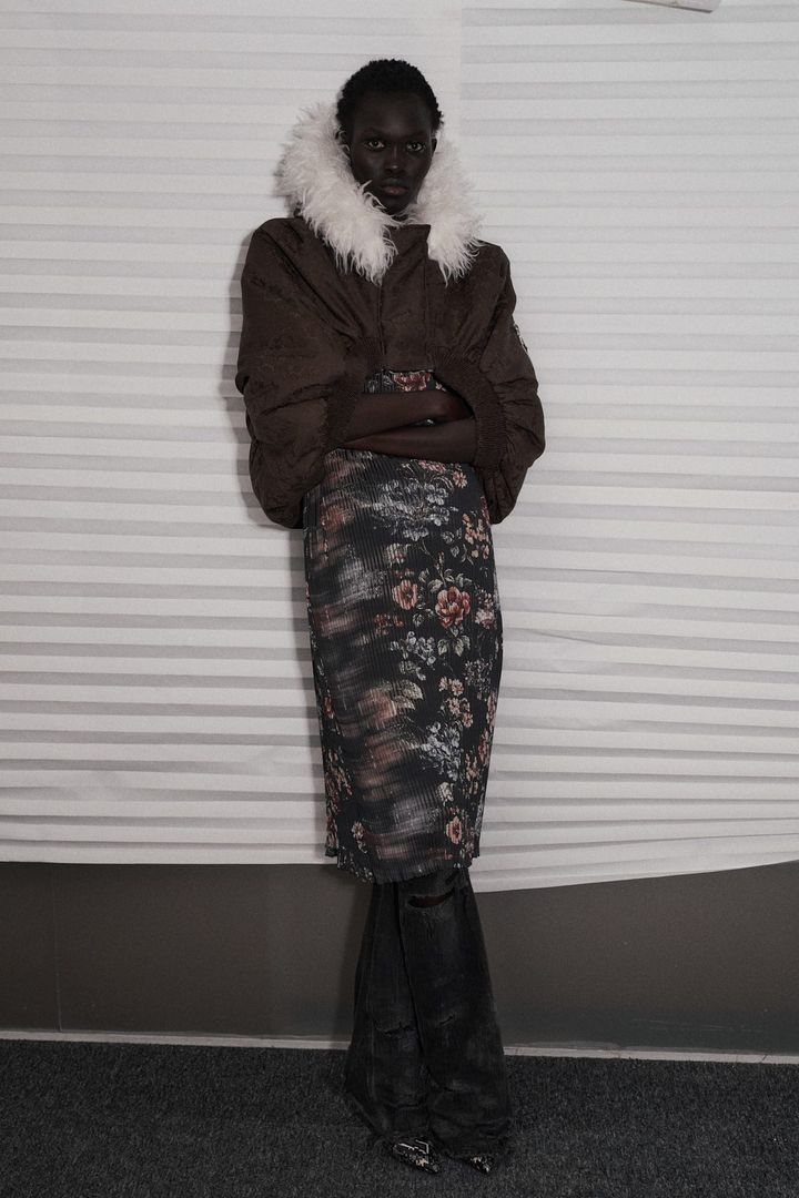 進化したレンチキュラープリーツは、身体の動きに応じて表情を変え、静止と運動の境界を曖昧にする。同時に彼女は、スケート界に根強く存在する“純粋さ”や“従順さ”といった女性像の規範にも疑問を投げかける。わずかな違和感をはらんだシルエットや露出が、その均衡を静かに揺さぶる。素材にはリサイクルポリエステルや植物由来のフェイクファーを用い、機能と倫理を両立。だが何より印象的なのは、どこか反逆的な精神を帯びた、服に宿るアティチュードだ。理想の女性像を思い描き、その人物像をなぞるように服を立ち上げていくプロセスを、彼女は「メソッド・デザイン」と呼ぶ。ショーの傍らでモデルたちを見つめる彼女の姿は、その変容がすでに始まっていることを物語っていた。