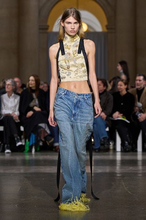 例えば、マリア・カラス(2024-25年秋冬)とラドクリフ・ホール(2025年春夏)による“架空の対話”は、クリスタルをちりばめたジャカードのオペラコートに、チェック柄のライニングを忍ばせ、ブラトップを合わせるという大胆なレイヤリングへと結実した。デューク・エリントン(2018年春夏)を象徴するリボンのディテールが随所に配され、生物学者であり植物画家でもあったマリアンヌ・ノース(2015年春夏)を称えるうっそうとした自然のモチーフがドラマチックに重なる。自身の卒業制作に登場したジーンズのルックは、クチュールドレスから引用したトップスと組み合わされ、20年以上の時間を経て新たなルックへ。若き日の実験精神と、成熟したブランドの技術が一つの装いの中で共鳴する。