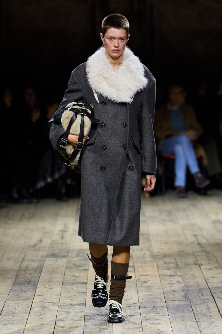 そして終章は、彼女のシグネチャーであるロゼットリボンが主役。一方で、メタルのグロメットやハーネス風のハードウェア、ダークなシアリングガウンが荒々しさを添える。ショーポニーを思わせるドレスは、長いリボンのロゼットだけで構築されたかのようで、タフタドレスのヒップにはリボン結びを模したポケットがあしらわれた。一方で、メタルのグロメットやハーネス風のハードウェア、ダークなシアリングガウンが荒々しさを添える。甘さと粗さ、夢と日常がせめぎ合いながら、実用的なアウターが全体を引き締める。「手仕事的で職人的なピースもあれば、より認識しやすいシルエットに落とし込んだものもある。純粋さや何かを追い求める姿勢、そしてそれがもしかすると実体のないものかもしれないという現実、その両方を見せたかったんです」と締めくくったロシャ。神話とストリート、幻想と現実を縫い合わせながら、彼女は永遠を“いま”の感覚で更新してみせた。