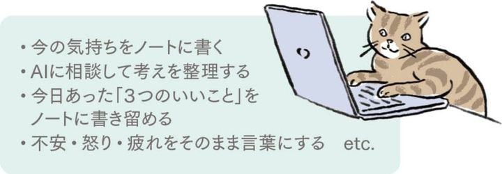 思考や感情を外に出すことで、ストレスが軽減すると言われている、話題の「ジャーナリング」です。紙にペンで思いを書き出してもいいし、気持ちがすっきりするのであれば、AIに相談して考えをまとめてもOK。