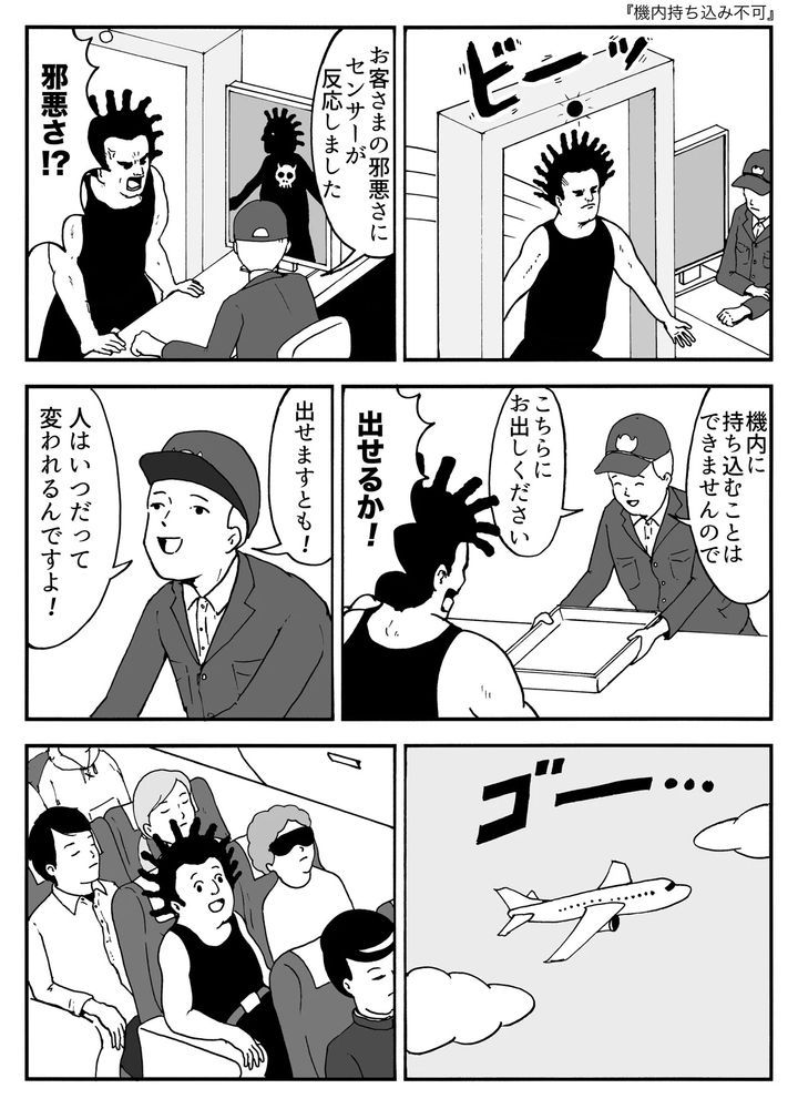 係員の男性は、その邪悪な心は機内に持ち込めないので、出すようにと言ってきます。乗客は「出せるか!」と怒り出してしまいましたが、係員の男性は爽やかに「出せますとも!人はいつだって変われるんですよ!」と応対するのでした。