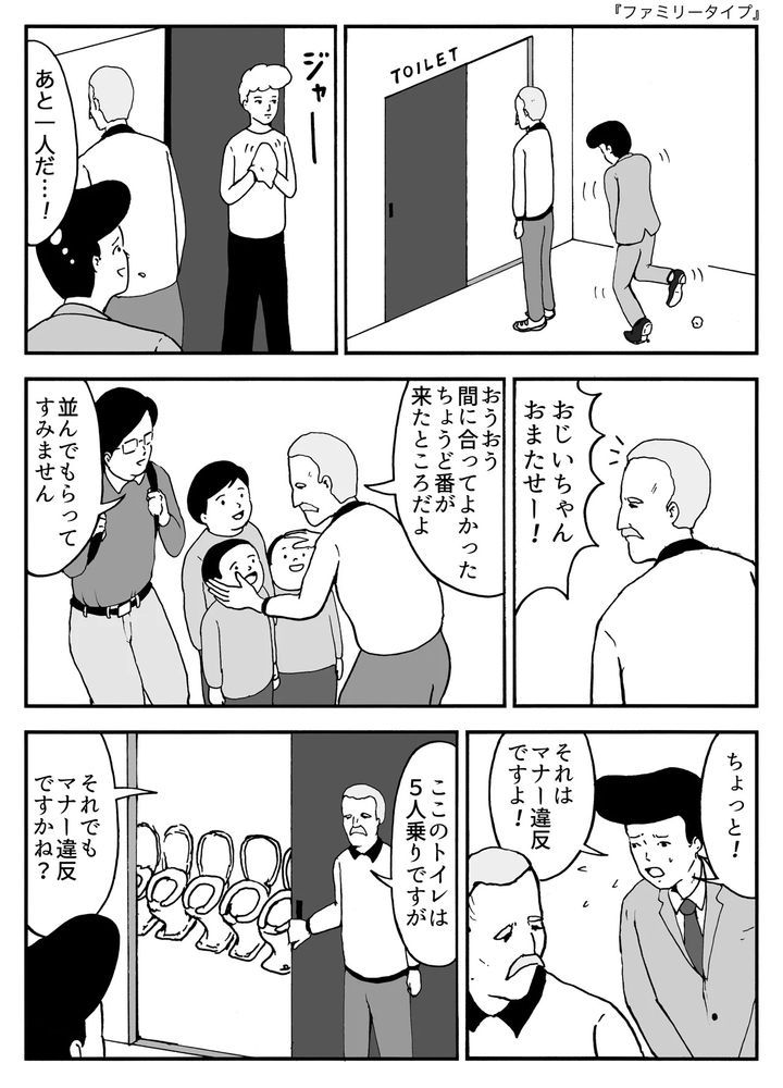 2. トイレの列に家族を割り込ませる男性→マナー違反ではないと言い張った"珍光景"とは【漫画】