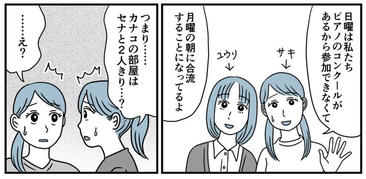 カナコの班は4人部屋ですが、そのうちサキちゃんとユウリちゃんは大事なコンクールがあるため2日目の朝に合流するそうです。つまりカナコが泊まる部屋はセナちゃんと2人きり……。絶句してしまいました。ありえません。