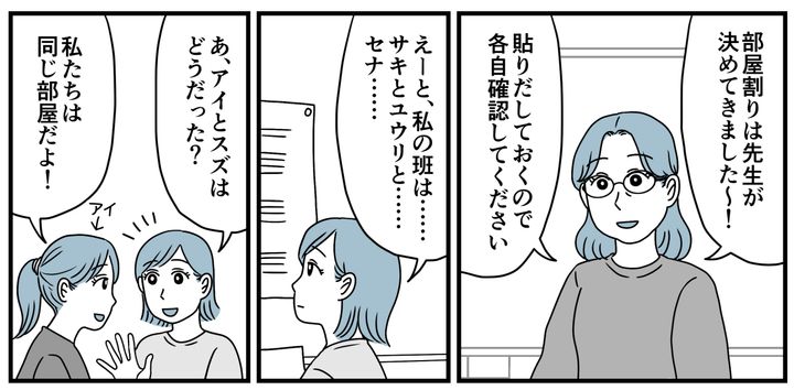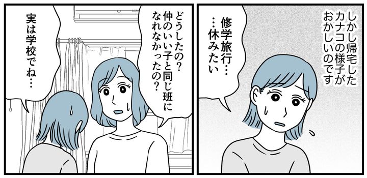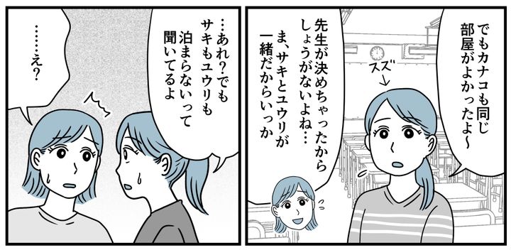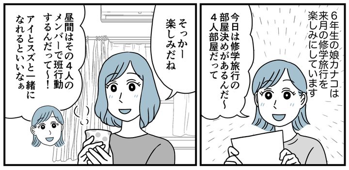 しかし部屋割りが決まった日、帰宅したカナコは「行きたくない」とうつむいて言い出したのです。事情を聞いて驚きました。4人班のうち2人が翌日合流になるため、カナコはセナちゃんと2人きりの部屋で泊まることになるというのです。担任の先生は事情を知っているはずなのに……。私はあまりの衝撃に絶句してしまいました。