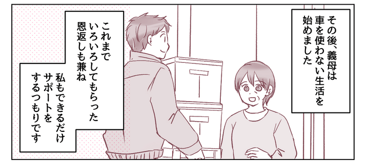 その後、義母は車を使わない生活を始めました。これまでの恩返しだと思って、私も日常的に送迎や手助けをしていくつもりです。なかなか大変かもしれませんが、頑張って支えていきます。