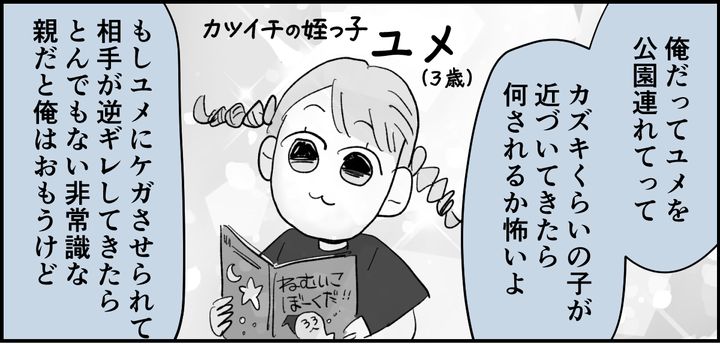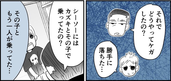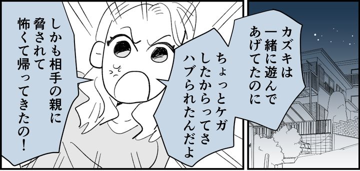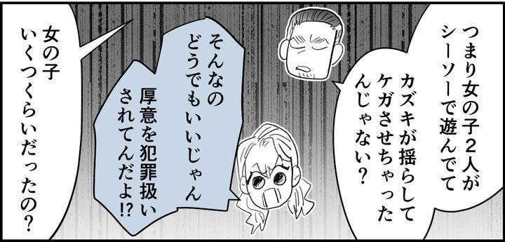 私はモモ(27)。旦那はカツイチ(27)です。息子のカズキ(小4)は今日公園に遊びに行っていたのですが、一緒に遊んでいた小さい子が、遊んでいる最中にケガをしてしまったそうです。そのことでカズキは相手の母親に怒られて公園を追い出されてしまったそうです。でもそれってカズキのせいなの? そんなの追いかけっこをしたりして、たまたま相手が転ぶことだってありますよね。公園から追い出されるようなことではないんじゃないですか? 腹が立って、相手の親に文句を言うために公園に向かいました。けれど神経質なタイプの親で、こちらを舐めていると感じたのです。