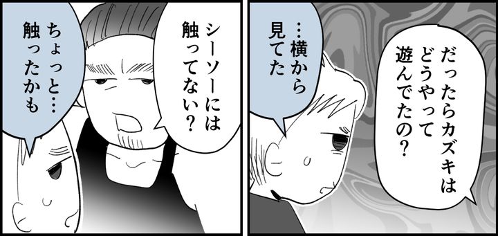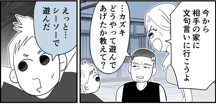 すぐにでも相手の家に行きたいのに、旦那はカズキに詰め寄っています。子どもの記憶なんて曖昧です。話を聞けば聞くほど無駄な時間だと感じてイライラします。