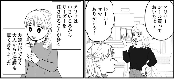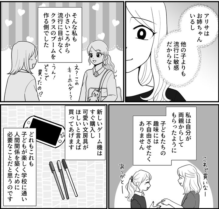私はレイコ(30代)。娘のアリサ(小2)は、昔からリーダーシップのある子です。3つ上にお姉ちゃんがいるのですが、お姉ちゃんから情報を仕入れたりしているので、クラスでもあか抜けていて、流行を作り出すような子です。洋服や遊びなど、私も流行をチェックして、アリサになるべく買ってあげるようにしています。そういった面から友達が増えたり、信頼関係が生まれたりすると思っているからです。私が両親にそうしてもらったように。