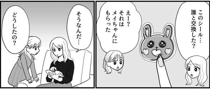 アリサのシール帳を見ていると、違和感があるシールを発見しました。アリサに誰と交換したシールなのかを聞くと、メイちゃんとのこと。