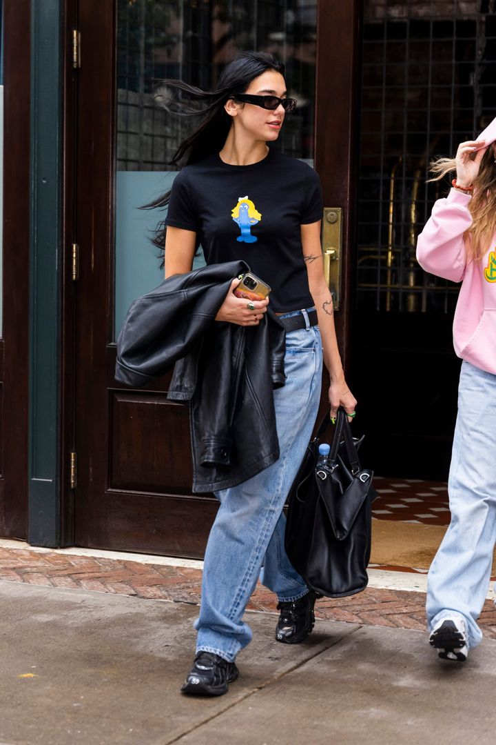 これがヘイリー・ビーバーの定番スタイル。クロップドTシャツでタイトさを保ちつつ、ボンバージャケットでボリューム感をプラスすれば、あとはデニムがすべてをまとめてくれる。