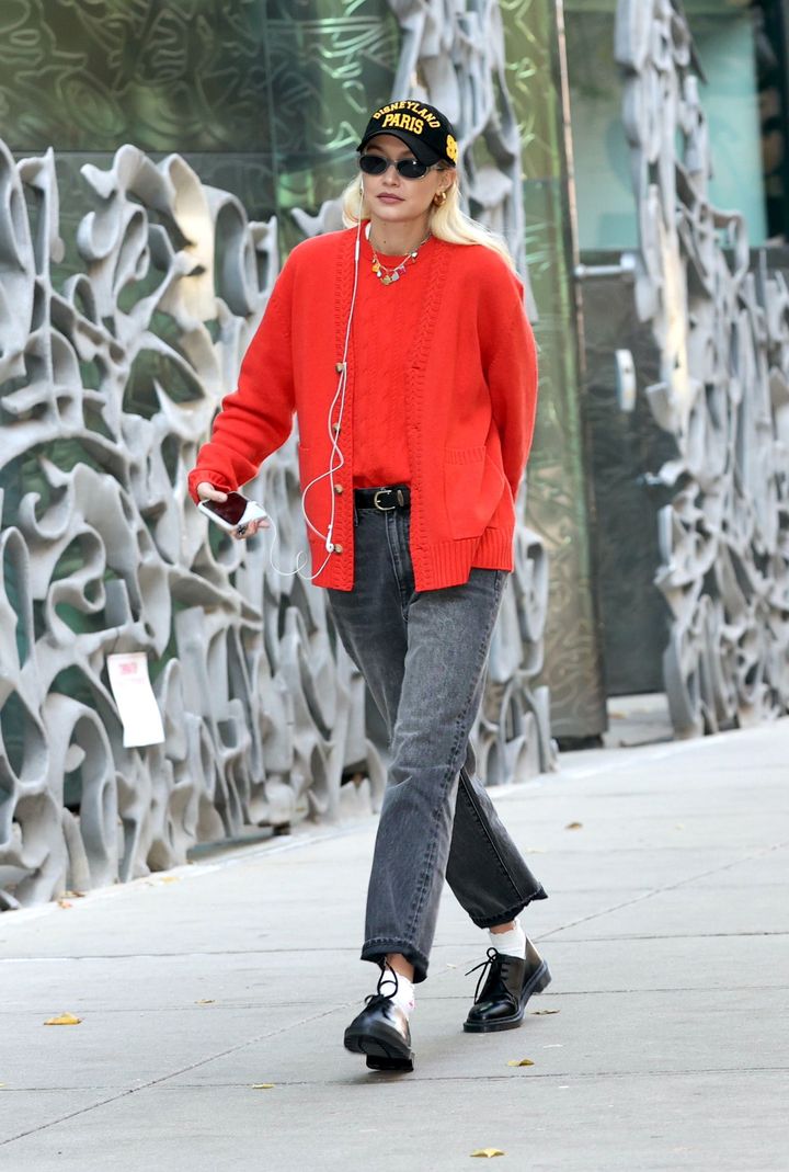 デニムがシンプルなら、セーターで遊ぶ余白が生まれる。大胆なデザインのニットを取り入れるだけで、一気に計算されたコーディネートに格上げされる。ジジ・ハディッドも、そのセオリーをよく知るひとりだ。