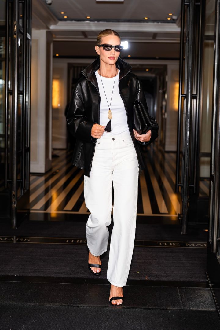 コーディネートに迷ったら、レザーをプラスしてみて。ロージー・ハンティントン=ホワイトリーがこのスタイルを定番にしているのには、確かな理由がある。