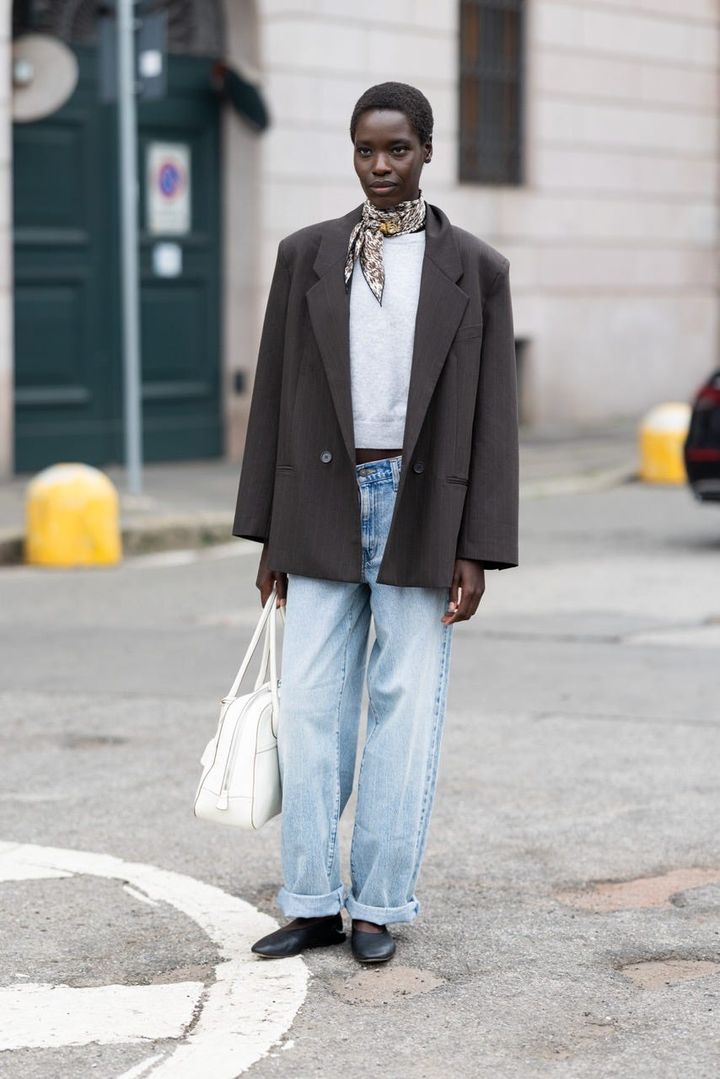 ボクシーなブレザーはプロポーションに絶妙なコントラストをもたらしてくれる。インナーにはフィット感のあるアイテムを選ぶのが絶対条件。そして、スカーフを仕上げのアクセントに。