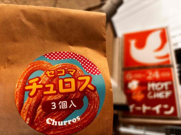 ホットシェフ取扱店で、お店で揚げてくださっているチュロスは、本場スペインの味!生地はほんのり塩味!のPOPと共に、カゴに入って陳列されています。