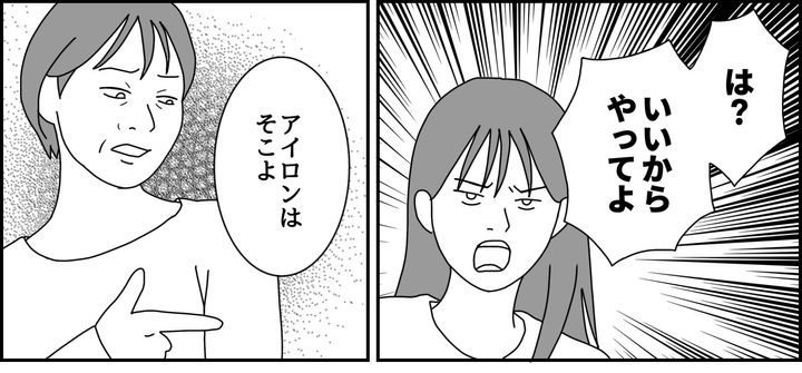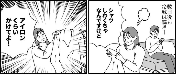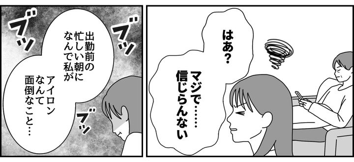 週末を挟んでも冷戦が続く中、メイは出勤前に私にシワくちゃのシャツを突き出して、アイロンをかけるよう命じてきました。私はその言葉に静かな抵抗を決意し、きっぱり拒否。メイはふてくされながらも不慣れな手つきでアイロンをかけ始めましたが、案の定うまくいかなかったようです。
