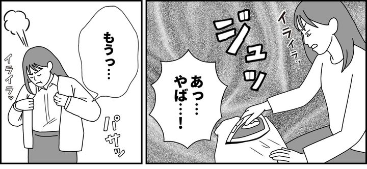 メイがしわくちゃのシャツやアイロンと格闘しているのを、私は横目でそっと見ていました。すると……「ジュッ」と音がしたのです。焦げたようなにおいがわずかに立ち上がります。