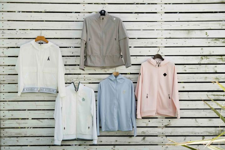 <上左>白のフーデッドアウター¥¥31,900(アダバットストリーム/ワールド)<上右>グレージュのアウター¥39,600(デサントゴルフ/デサントジャパンお客様相談室)<下左>白のアウター¥27,500(マンシングウェア/デサントジャパンお客様相談室)水色のアウター¥17,600(ロサーセン/グリップインターナショナル)ピンクのアウター¥39,600(ブリーフィング ゴルフ/ブリーフィング 六本木ヒルズ店)