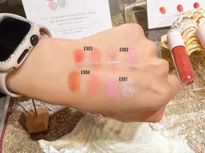 <カラー展開> EX01 Under the Palms:やわらかくマットなピュアピンク×澄んだ光を放つハイライトで、にじむようなイノセントが宿るスウィートフェイスカラー EX02 Salty Air:くすみ色のモダンなマットモーブ×グロウなヌードベージュで、ファジーな色調が紡ぐセンシュアルなモードカラー EX03 Sun & Sand:ニュートラルに色づくマットテラコッタ×ジューシーなアプリコットで、陽に照らされた高揚感をもたらすヘルシーなサニーカラー EX04 Tropic Flush:肌に溶け込むマットなペールブラウン×フレッシュなコーラルピンクで、エフォートレスな抜け感をかなえるスキントーンカラー