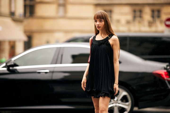 繊細な質感のストレートに重めバング。フェミニンな黒のプリーツドレスに、甘すぎないモードなエッセンスを。