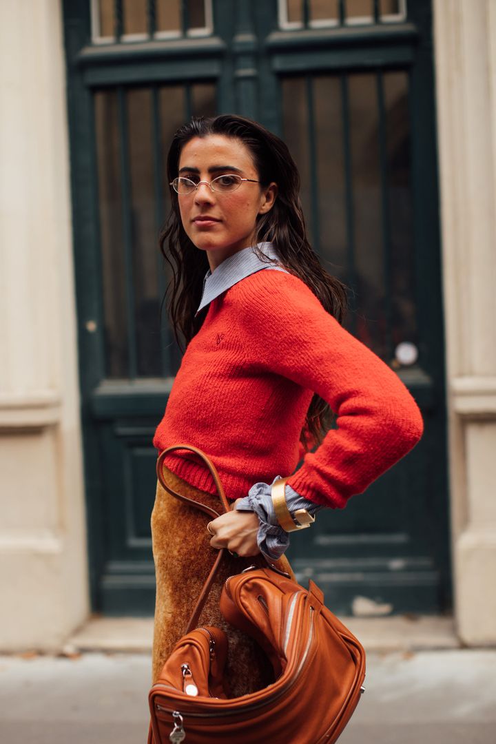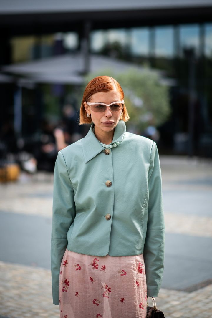 ビビッドなオレンジボブをタイトに流し、レトロな配色の装いとコントラストを。