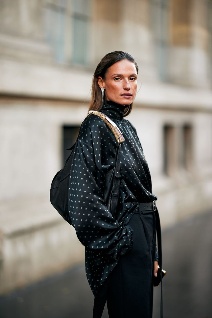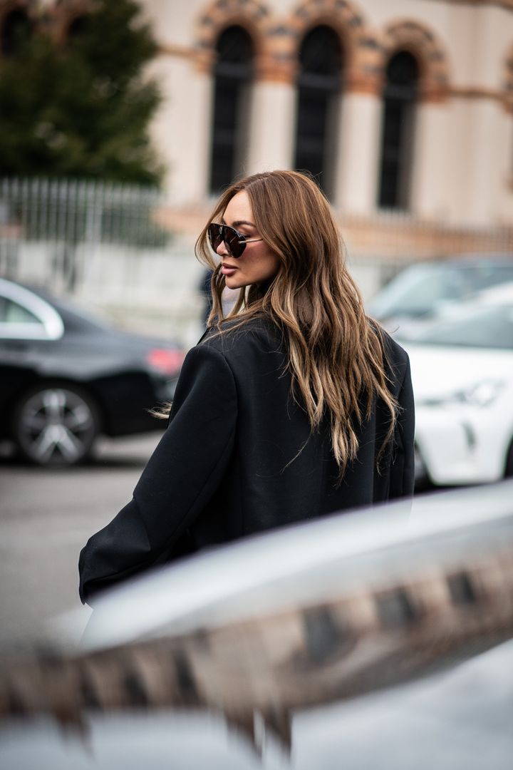 黒のビッグジャケットにラフなウエーブヘア。サングラスのスパイスも含め、リュクスな大人の余裕が感じられる。「ハイライトを入れたロングヘアでシックなファッションを軽やかに見せるバランスが上手」(LISAさん)
