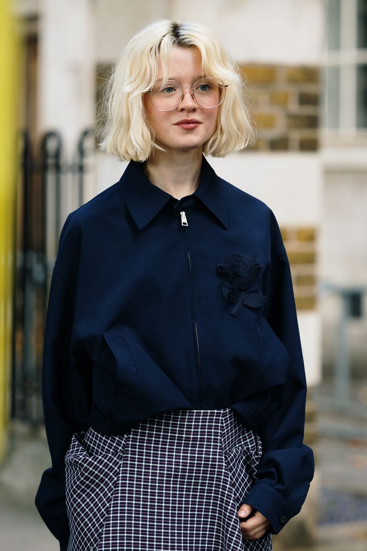 ハイトーンのウェービーボブに知的なメガネをオン。プレッピースタイルに、髪の柔らかな質感が程よい甘さを添える。「ウェーブのかかったサイドフリンジが今っぽい。 メガネを含め、ナードなスタイルともマッチ」(KEIKOさん)